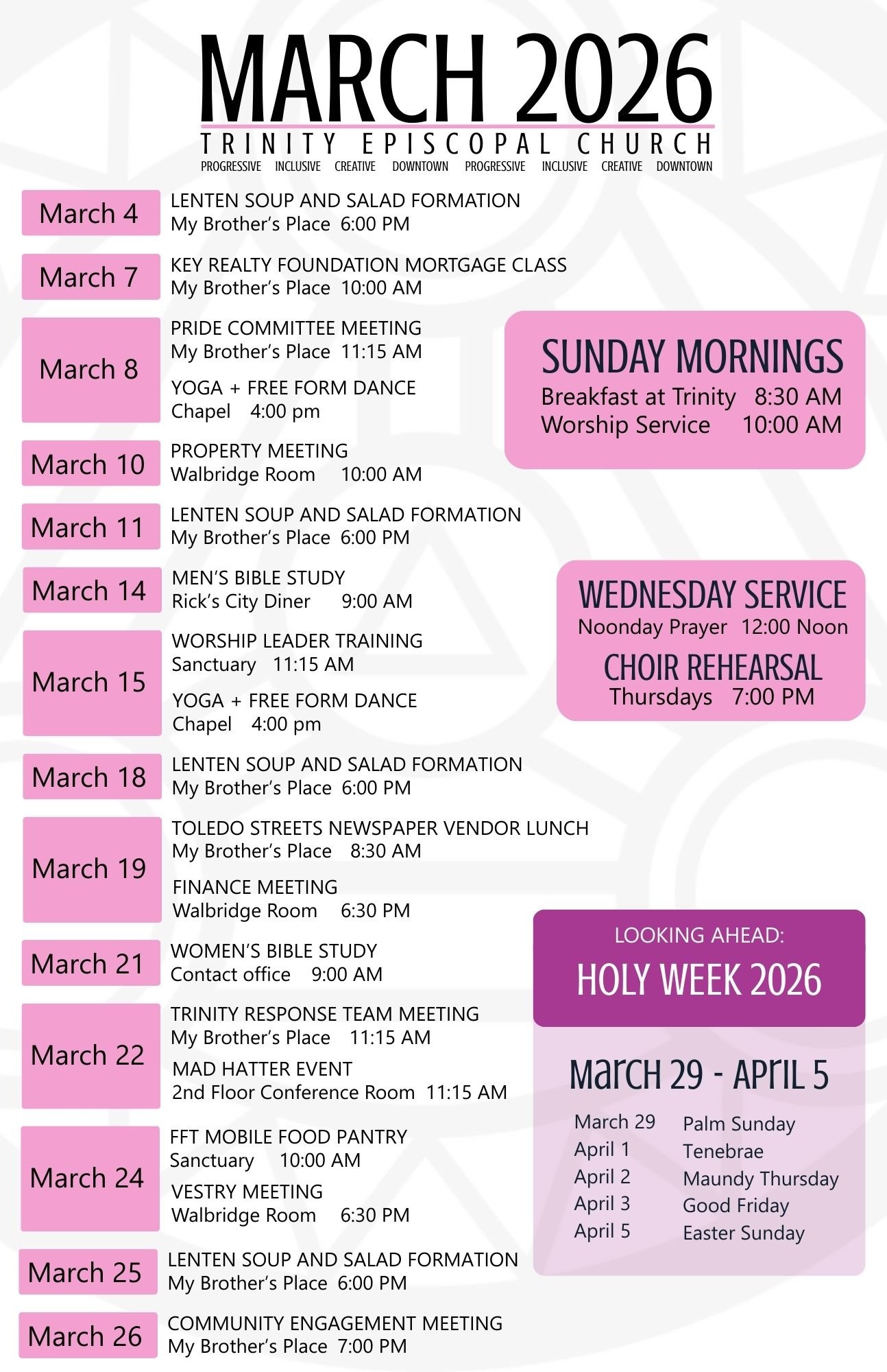 Trinity continues to have an active prayer list. If you’d like prayers for yourself or for someone you know, you can request them by contacting the Trinity office (trinity@trinitytoledo.org or 419-243-1231). All prayer requests are shared only with a small intercessory prayer group who, along with parish clergy, offer recurring prayers for each request. When a request is received, it remains on the prayer list for four weeks before it’s taken off. Requests can always be renewed or submitted again; having an “expiration date” simply prevents the list from overflowing with prayer requests that are out of date.