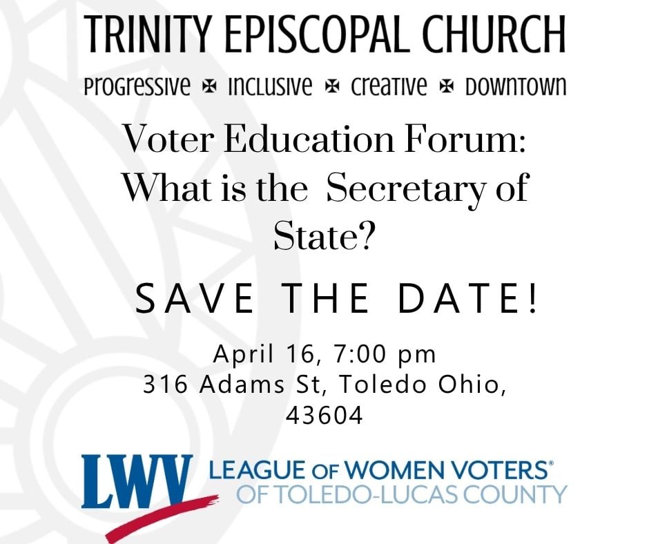 April 16 at 7pm - Trinity and the League of Women Voters are hosting a forum around the Secretary of State’s role in Ohio, where Bryan Hambley and State Rep. Allison Russo will be participating. Questions, thoughts? Email george@trinitytoledo.org