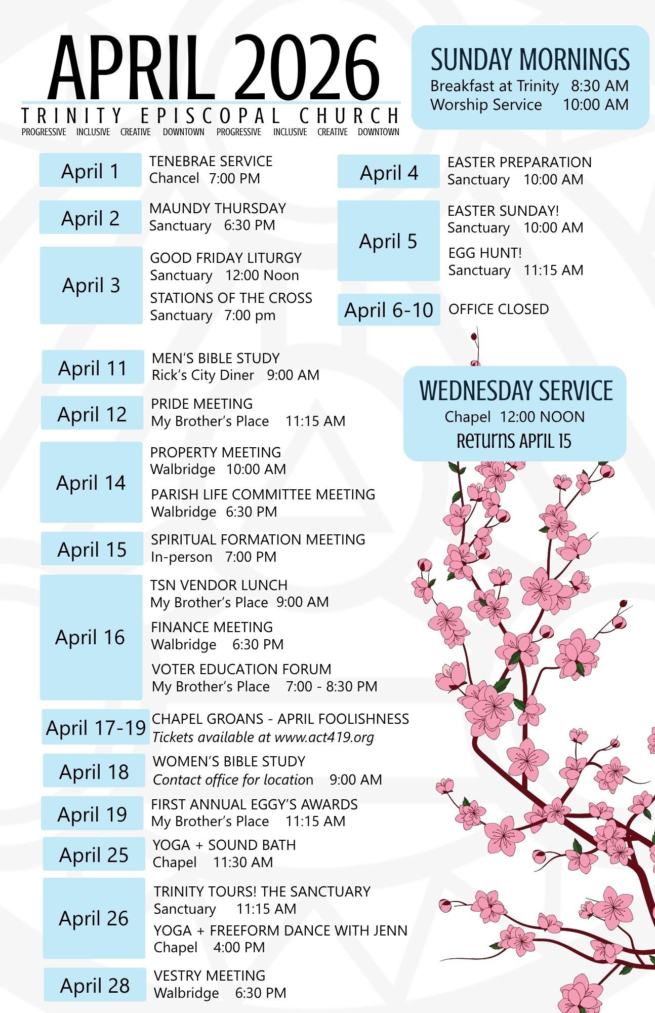 Sun. April 26 after worship - Following worship on April 26, you are invited to a special tour (the piece de resistance!) of our historic nave. Our sacred space has been a beacon of faith and beauty since its dedication in 1863. We will explore the artistry, symbolism, multiple renovations, stained glass windows and stories. If any of our parishioners have stories or experience around the most recent renovation 25 years ago, Heather would love to hear from you as she prepares! heather@trinitytoledo.org