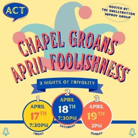 ACT - Chapel Groans - April Foolishness - Get ready for round two of Toledo’s first-ever improv festival. Actors Collaborative Toledo (ACT), in partnership with local improv troupe Smellybutton, is proud to present Chapel Groans – April Foolishness, the spring follow-up to last fall’s inaugural festival. April 17-19 in Trinity's Chapel. $10 per night or $25 for a festival pass (all three performances). Seating is limited; advance reservations are recommended. Tickets are available at https://act419.booktix.com/