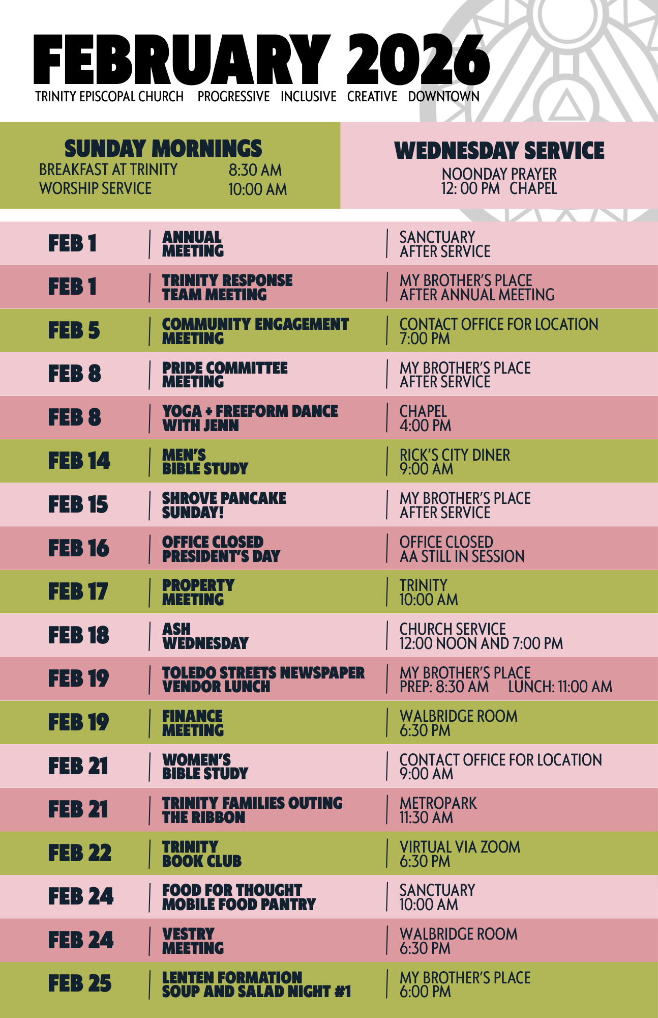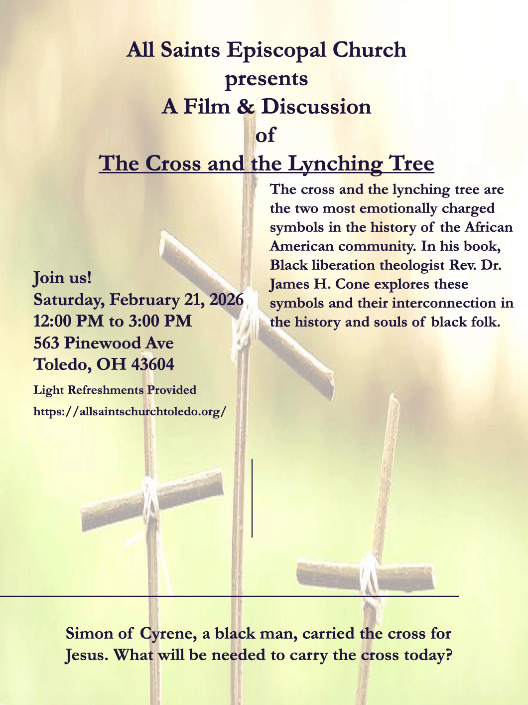 Feb 21: Join our friends at All Saints Episcopal for Cross and The Lynching Tree film and discussion from 12-3pm. The church address is 563 Pinewood Avenue, Toledo, 43604.